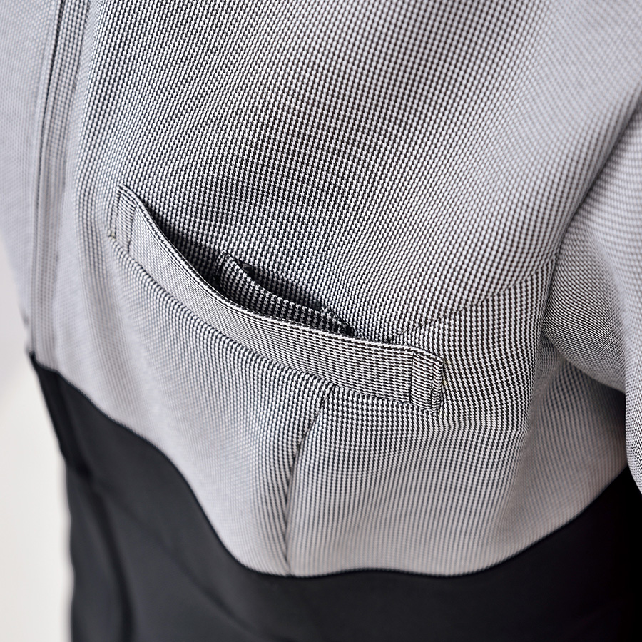 - 左胸・両脇ポケット(右のみ二重ポケット)、右脇ループ付、前ファスナー開き、胸ポケット内側共布ループ付